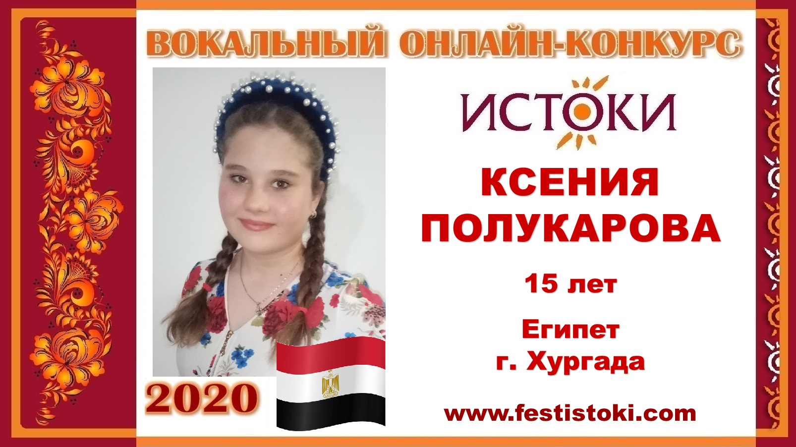 КСЕНИЯ ПОЛУКАРОВА, 15 лет (Египет, г. Хургада). "Гляжу в озера синие"