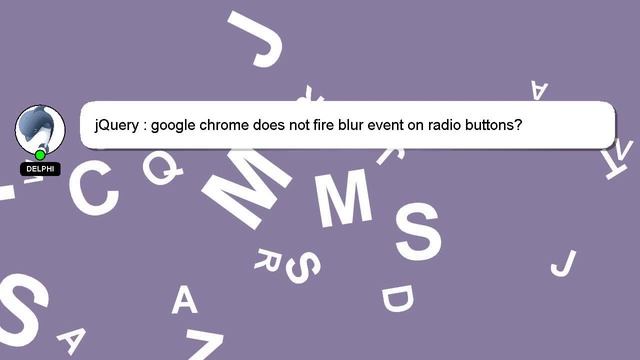 jQuery : google chrome does not fire blur event on radio buttons? To Access My Live Chat Page, On Google, Search for "hows tech developer connect" As promised, I have a hidden feature that I want to share with you. This is a YouTube's feature which works on Desktop. First, Ensure that the video is playing before proceeding. Then, type the letters 'awesome' on your keyboard as the next step. The progress bar on YouTube will be altered to a flashing rainbow. An introduction to myself in a few words, Hello there, my name is Delphi. I am happy to help you with your questions. jQuery : google chrome does not fire blur event on radio buttons? I welcome your comments and chats if you have more detailed queries. Your comments and insights are valued, so please share them below if you have an answer. Your answer will be acknowledged and appreciated, and I will 'heart' it as a sign of gratitude. google event jQuery radio does buttons? : not chrome blur on fire