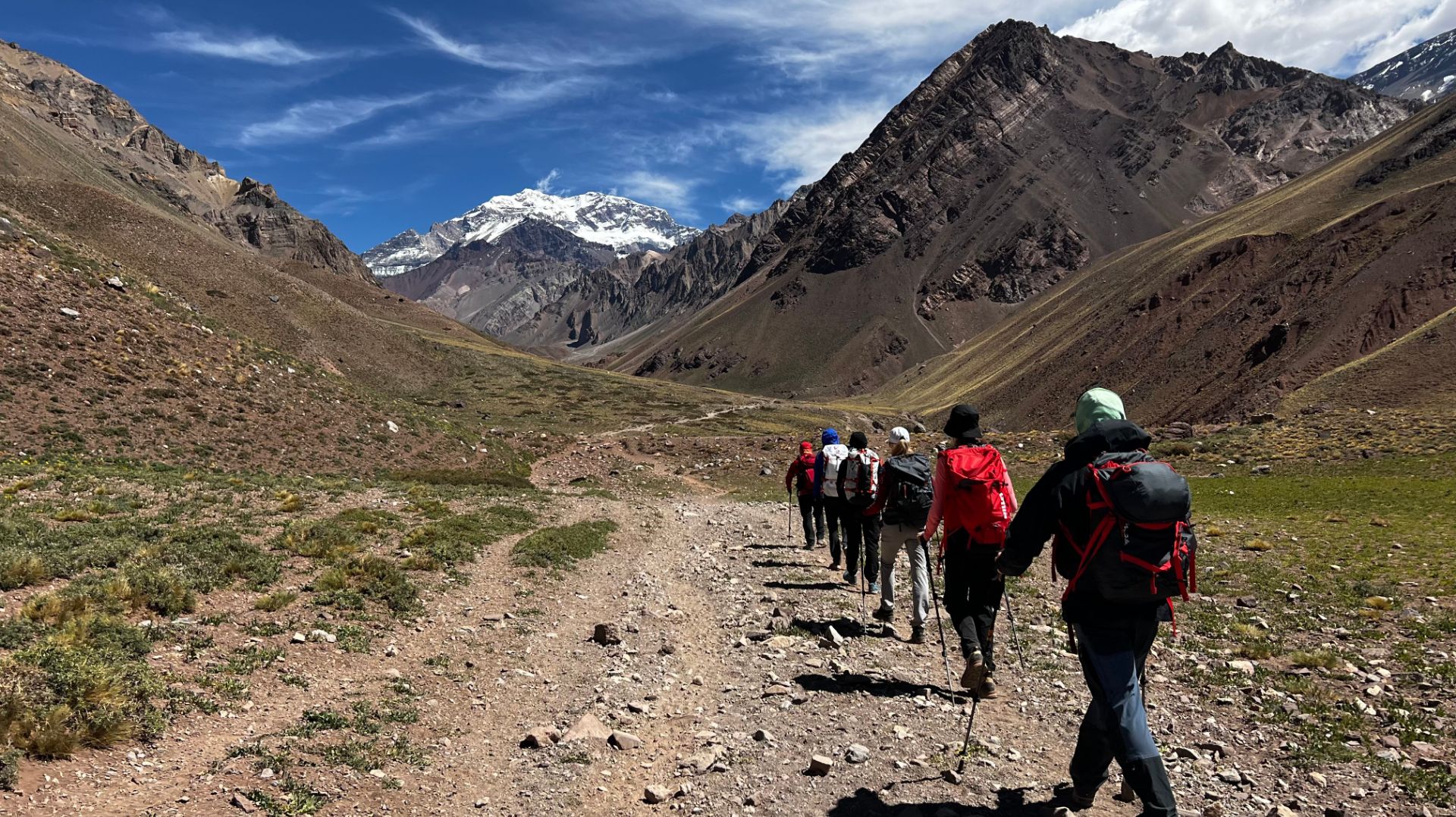 Физкульт-привет из солнечной Аргентины! Сегодня наша супер-группа совершила переход от входа в нацпарк Аконкагуа, где мы отметили наши пермиты, к первому лагерю Конфлюэнция (3300м.). Прошли этот этап в хорошем темпе за 2 часа 40 минут, состояние группы отличное. Гиды группы Дмитрий Семёнов и Георгий Бушуев.