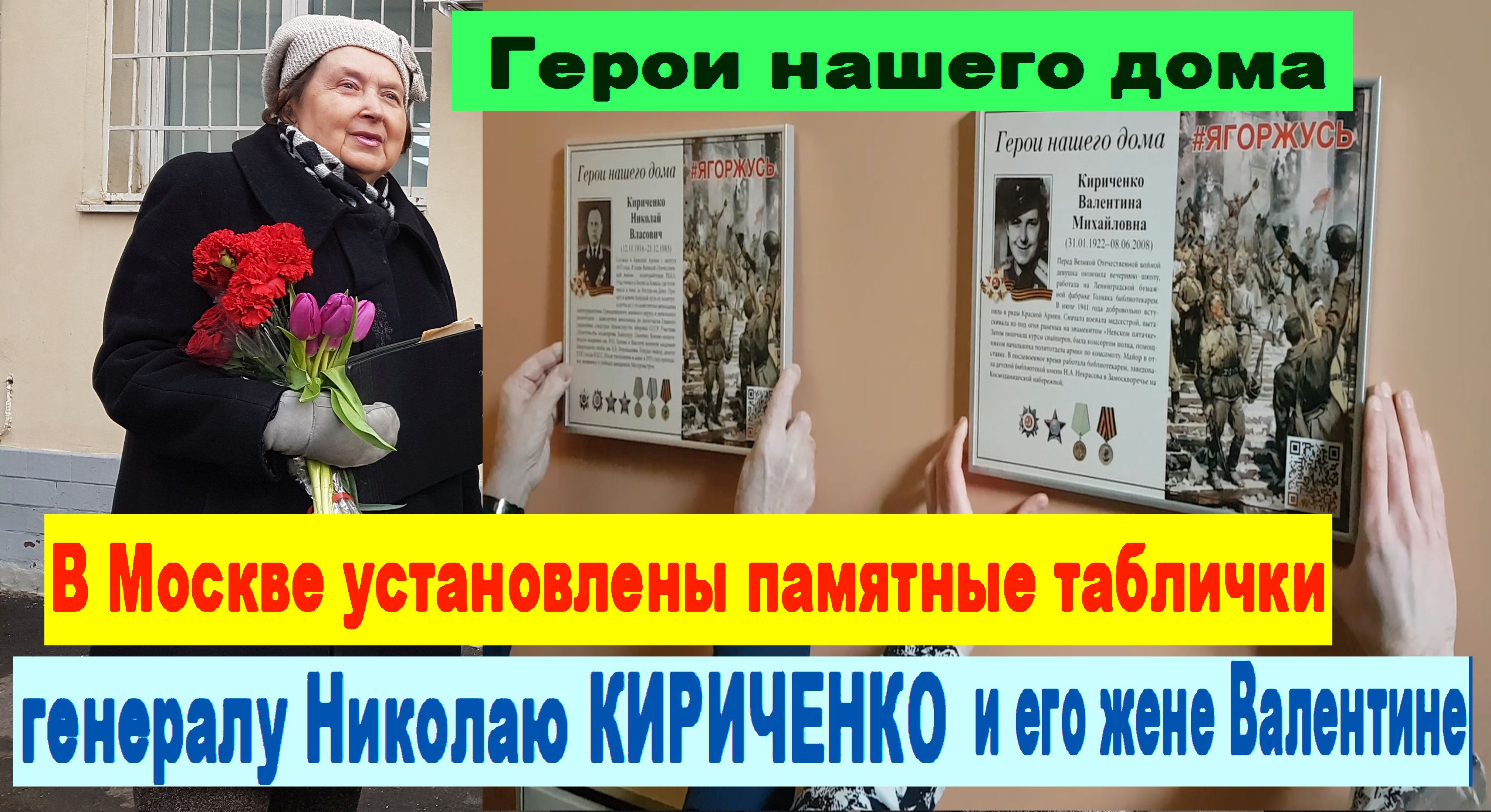 Герои нашего дома. В Москве установлены памятные таблички генералу Николаю КИРИЧЕНКО и его жене Валентине. Торжественное мероприятия состоялось в доме на Космодамианской набережной, 36, в котором жили супруги — участники Великой Отечественной войны. Значимое патриотическое мероприятие организовала дочь — известная журналистка Татьяна Драгныш при поддержке ветеранов Центрального административного округа Москвы. См. видео. Ждём комментарии!