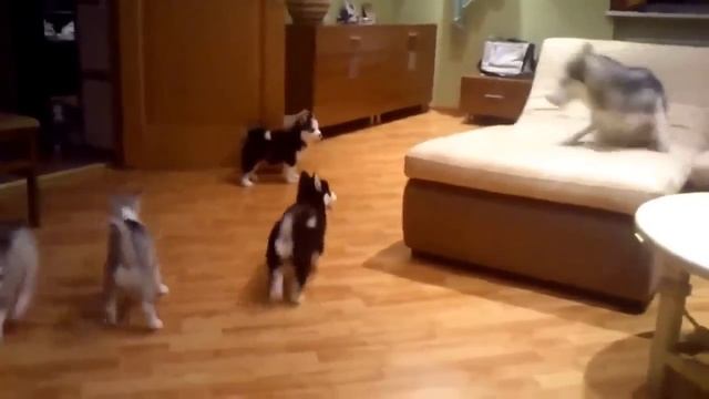 Мама Хаски играет с щенками-детками