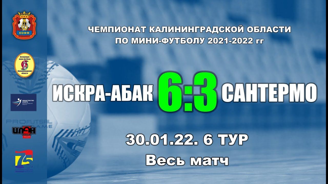 30.01.22. Чемпионат Калининградской области по мини-футболу. Суперлига. 6-й тур. «Искра-АБАК» - «СанТермо» 6:3 (1:1). Весь матч Голы забили: Д.Архипов (19'), С.Фазуллин (21'), В.Раков (23'), Г.Новиков (28', 38'), А.Музыка (40') -- Т.Ибадов (10', 31'), А.Можаровский (36', П) Предупреждены: В.Раков (И) -- Д.Майков (С), Д.Сасковец (С)