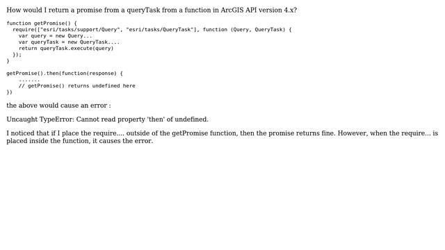 GIS: Returning a promise from a function in ArcGIS API JavaScript version 4.x Helpful? Please support me on Patreon: https://www.patreon.com/roelvandepaar With thanks & praise to God, and with thanks to the many people who have made this project possible! | Content (except music & images) licensed under CC BY-SA https://meta.stackexchange.com/help/licensing | Music: https://www.bensound.com/licensing | Images: https://stocksnap.io/license & others | With thanks to user hello123 (gis.stackexchange.com/users/143001), user GavinR (gis.stackexchange.com/users/5425), and the Stack Exchange Network (gis.stackexchange.com/questions/337329). Trademarks are property of their respective owners. Disclaimer: All information is provided "AS IS" without warranty of any kind. You are responsible for your own actions. Please contact me if anything is amiss at Roel D.OT VandePaar A.T gmail.com