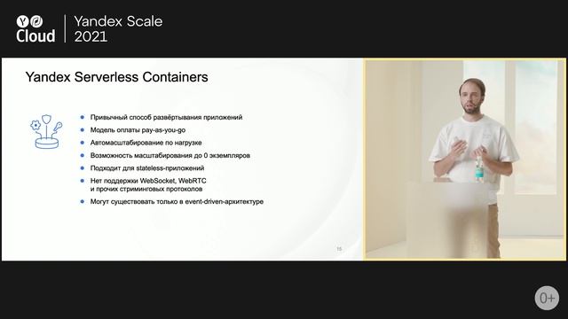 Serverless Containers и другие новинки serverless В экосистеме serverless в Yandex.Cloud за прошедший год появилось много новых возможностей, но мы не останавливаемся на достигнутом и в докладе рассказали о совершенно новых сервисах и возможностях, которые помогут вам идти в ногу со временем. Больше информации: https://cloud.yandex.ru/services/serverless-containers Регистрируйтесь сейчас и получите на счет 4000 руб.
