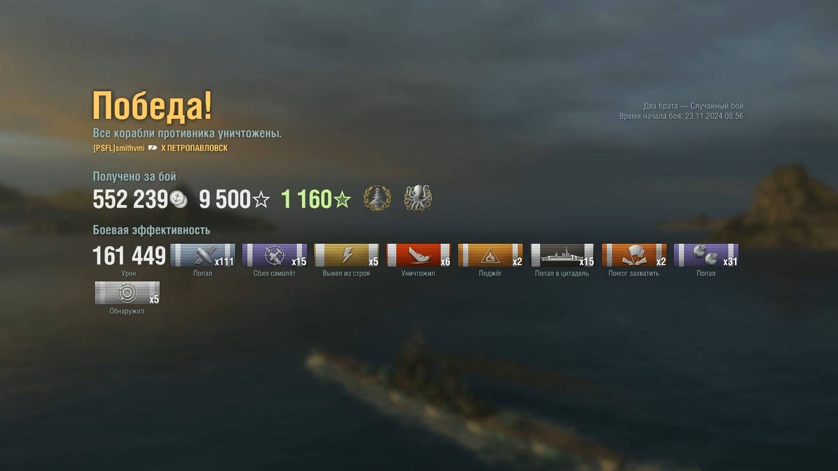 Крейсер Petropavlovsk. Игрок: smithvmi (NA). Карта: Два брата - Случайный бой. Урон: 161к. Petropavlovsk - Крейсер СССР 10 уровня.