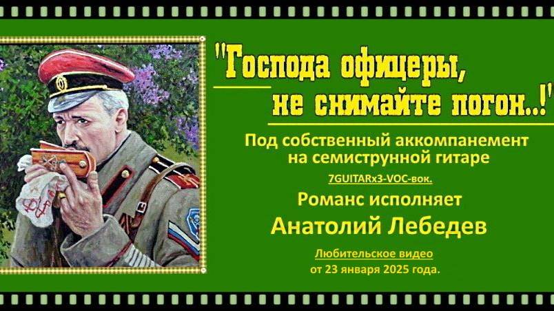 Анатолий Лебедев из Питера. ЛЮБИТЕЛЬСКОЕ ВИДЕО Анатолия Лебедева с его исполнением современного романса "ГОСПОДА ОФИЦЕРЫ, НЕ СНИМАЙТЕ ПОГОН" под собственный аккомпанемент на семиструнной гитаре. СЛОВА - Автор текста - ВОЛК АНГЕЛ (Стихотворение 2011 года.) МУЗЫКА - Вероятнее всего мелодией этого романса стала мелодия другого романса 1930-тых годов "Избушка" автора и исполнителя СЕРЖА НИКОЛЬСКОГО. Уж больно эти две мелодии похожи! Явный плагиат! К тому же, мелодия "Избушки" явно, неоднократно использовалась в других "белогвардейских романсах , написанных на волне популярности белоэмигрантских тем в 1970 годах . Особенно заметными стали "белогвардейские" романсы на стихи ВЛАДИМИРА РАМЕНССКОГО и песни АЛЕКСАНДРА ДОЛЬСКОГО. В то время с В.Раменским тесно сотрудничал известный бард-исполнитель Аркадий СЕВЕРНЫЙ, который исполнял эти песни. Романсы эти хорошо известны, многими любимы и исполняемы до сих пор. Одним из лучших исполнителей белоэмигрантских романсов можно выделить замечательного шансонье МИХАИЛА ГУЛЬКО. Видеозапись исполнения романса "Господа офицеры, не снимайте погон", а так же монтаж видеоролика сделаны А. Лебедевым 23 января 2025 года.