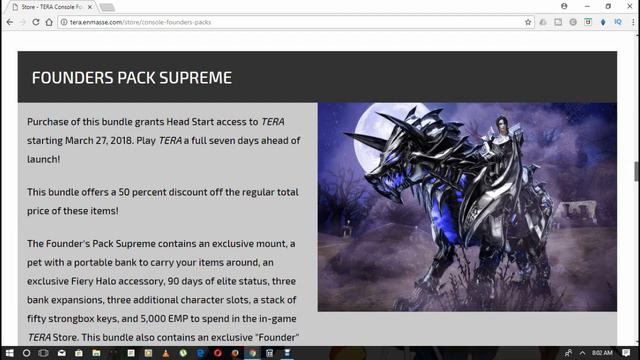 In this video ill be showing & discussing TERA Console Release Date and Founders Packs available. Link To Official Release date and founders packs: http://tera.enmasse.com/store/console-founders-packs Join One Of The Best Guilds ON Tera:https://www.ascendumgaming.com/ UPDATE!!!! Prices of Founder's Packs in NA should be as follows: Founder's Pack = $29.99 Founder's Pack Deluxe = $59.99 Founder's Pack Supreme = $99.99 Founder's Pack Ultimate = $149.99 En Masse Entertainment announced today that Tera is coming to PlayStation 4 and Xbox One on April 3. Tera is a free-to-play massive multiplayer online role-playing game. It focuses on fast-paced, real-time action. The PC version came out in 2011 and has over 25 million registered players. Expanding to console will open the MMO up to a new audience. You can buy a Founder’s Pack that includes in-game items like a special mount, and it will also give you early access to the console versions. You can start playing on March 27.