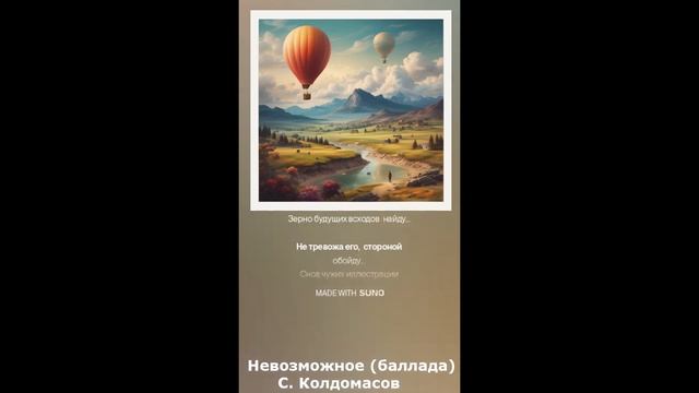 Баллада... Текст - С. Колдомасов Аудио и визуал - Suno AI Стихи: Сергей Колдомасов - "Невозможное" (2019/03/20) (на сайте стихи.ру). Никакой вульгарщины или пропаганды, все совпадения чисто совпадения!