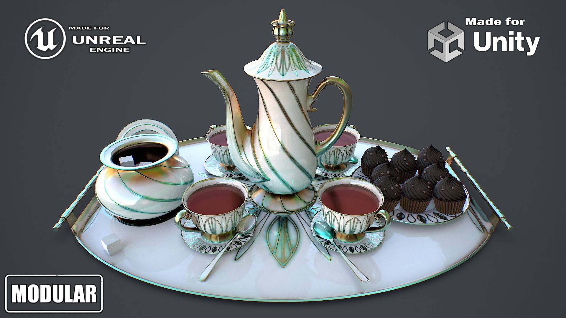 Tea Set 1 polys 155648 verts 149863 tris 311296 materials 10 textures 81 teapot, tea, set, bowl, cake, breakfast, tray, spoon, sugar, saucer, plate, jug, couple, cup, ceramic, mug, decoration, sweets, dishes, tableware, Hello. This is a high definition quality polygon of a Tea_set 1 3D Model with PBR textures. Extremely detailed and realistic. Suitable for movie prop, architectural visualizations, advertising renders, games, VR, AR and other. The archive includes Obj and FBX, Marmoset scene, textures for the Unity: Base color, Metallic, Mixed AO, Normal_OpenGL, Roughness. And also included in the archive textures for UE: BaseColor, Normal, OcclusionRoughnessMetallic. All textures are 4k resolution. The number of materials corresponds to the number of main objects in the scene. The model contains 83 objects: Tea_Set_1_tray, Tea_Set_1_teapot_lid_2th, Tea_Set_1_teapot, Tea_Set_1_tea_12th, Tea_Set_1_sugar_45th, Tea_Set_1_sugar_bowl, Tea_Set_1_spoon_4th, Tea_Set_1_plate_5th, Tea_Set_1_cake_8th, Tea_Set_1_mug_4th.