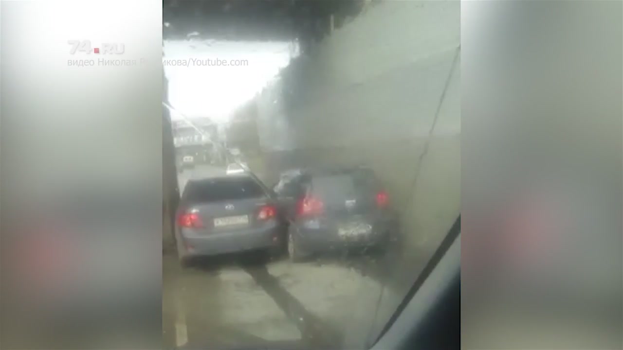 Две бабы в Челябинске решили проехать под мостом одновременно и встряли.
