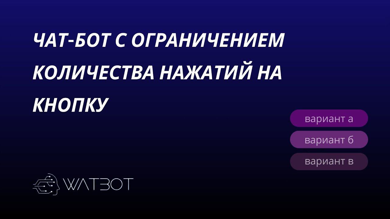 Всем привет! На связи команда Watbot - платформы-конструктора чат-ботов, которые вы можете собрать самостоятельно, не имея никаких навыков программирования! Бывает, что стоит задача ограничить количество нажатий на кнопку. Например, если пришёл первый вопрос с инлайн кнопками, пользователь, нажал на неё. Далее приходит второй вопрос. Но инлайн кнопки к первому вопросу остаются, не исчезают. И тут необходимо сделать так, что ответ уже не учитывался. Вы научитесь это делать с помощью данного видео! Подробности можешь узнать на нашем сайте https://watbot.ru/?utm_source=youtube Будем рады видеть вас в нашем сообществе, присоединяйтесь по ссылке https://t.me/watbotcommunity #чатбот #чатботы #бот #телеграмбот #боты