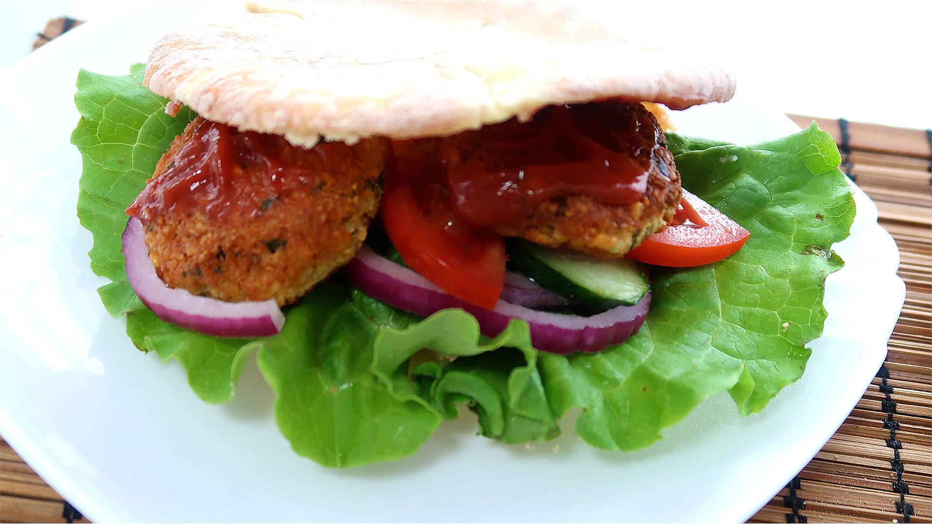 Фалафель получил широкое распространение в странах Ближнего Востока, где нут является основным ингредиентом национальной кухни. Моей семье тоже очень нравятся вкусные котлетки из нута. Нут - 300 г Лук репчатый - 1 шт Петрушка - пучок Соль, перец - по вкусу Паприка - 1 ч.л Мука - 2 ст.л Дополнительно: Растительное масло для обжарки Овощи, листья салата Томатный соус Тонкий лаваш или пита