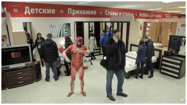 Человек в костюме мышц человеческого тела исполняет Harlem Shake. Harlem Shake в мебельном магазине.