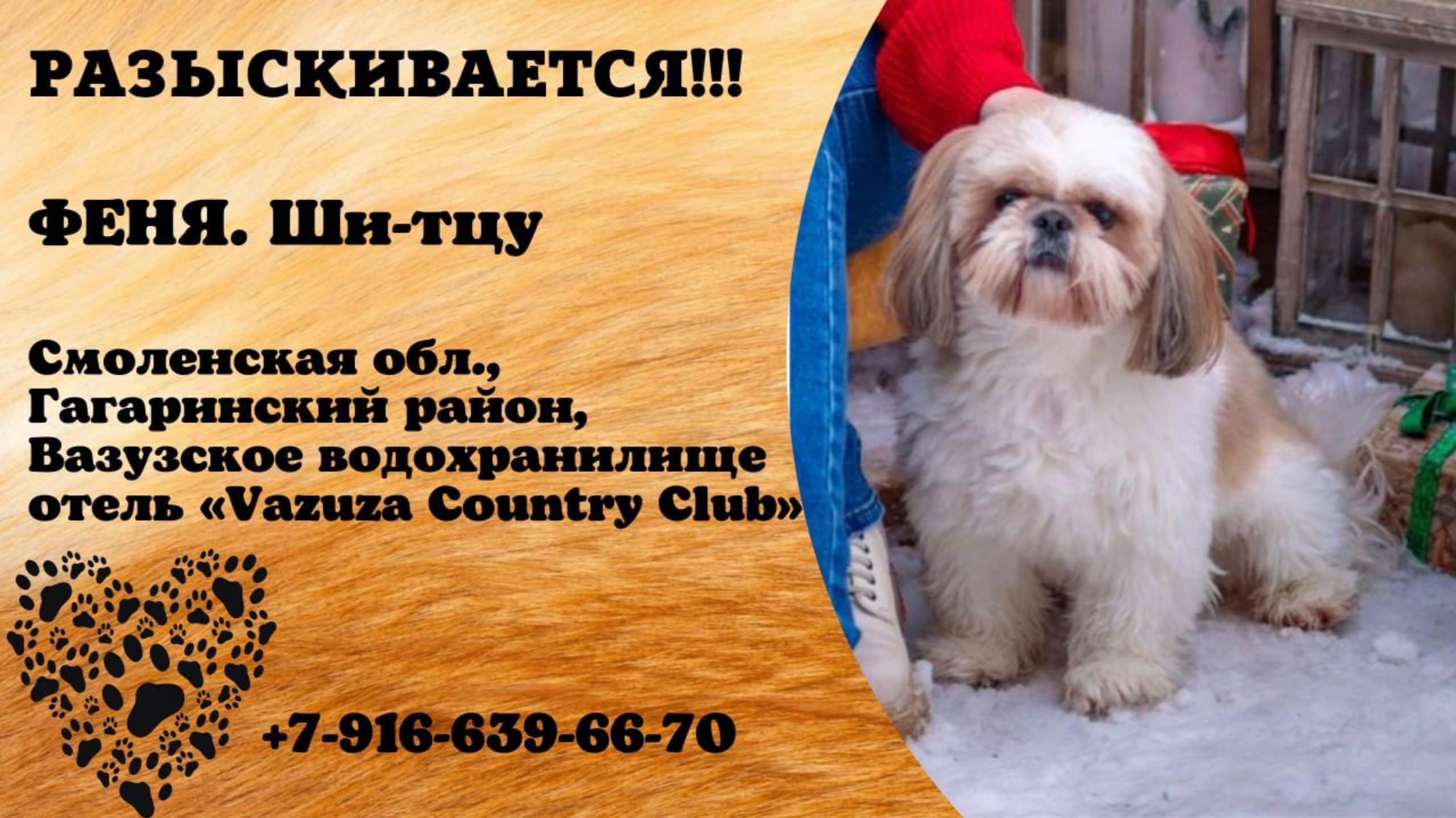 Смоленская Гагаринский район Пропала собака 01.01 в 00:20 Вазузское водохранилище, на берегу которого базируется отель «Vazuza Country Club». Мелкая порода, длинна шерсть, бело-рыжий окрас. Испугался салюта и убежал. По камерам отследили примерный путь, который затерялся в поле из-за снега Имя хозяина: Татьяна Телефон: +7 916 639-66-70 Инфо https://vk.com/wall-198815410_168074 #пропала_собака #московская #москва