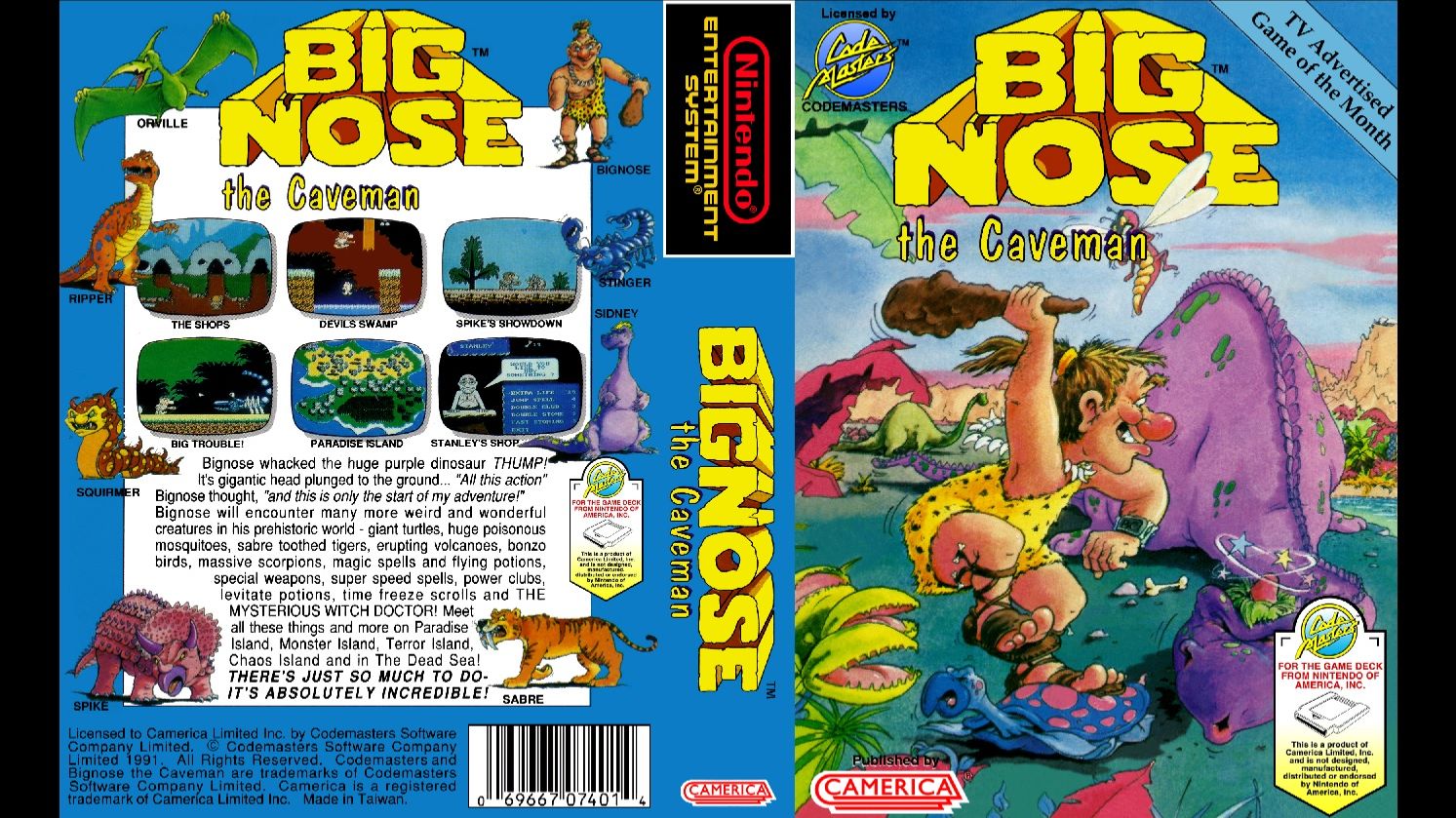 "BIG NOSE THE CAVEMAN" ("Большой Нос пещерный человек") - видеоигра в жанре платформер с боковой прокруткой, разработанная OPTIMUS SOFTWARE и выпущенная в 1991 году CAMERICA для NES и CODEMASTERS для AMIGA и ATARI ST. Версия для MASTER SYSTEM и GAME GEAR под названием "DINOBASHER" была завершена, но так и не была опубликована. В 1992 году последовало продолжение "BIG NOSE FREAKS OUT". Главный герой - носатый питекантроп, блуждающий по островам в поисках ужина. По пути он собирает кости, которые может использовать для покупки предметов в различных магазинах, включая заклинания и прокачку скилов облегчающих прохождение. Игра достаточно сложная из-за невозможности перезапуска с последней контрольной точки после потери жизней. Всего в игре четыре остова: Райский Остров, Остров Монстров, Остров Ужаса и Остров Хаоса, каждый из которых содержит несколько подуровней. "Большой Нос Пещерный человек" умирает от одного удара, если у него нет магических кристаллов. Дубину можно прокачивать, из неё могут вылетать камни, от одного до трех (такой себе дробовик). На пути Большого Носа встречаются ловушки, засады, водные и огненные преграды, которые можно перелетать быстро размахивая дубиной. В целом игра довольно унылая и скучная, музыка однообразная, геймплей незатейливый. В игре нет ничего революционного за что можно было бы её полюбить несмотря на заурядность, играть в такое можно только из-за чувства ностальгии.