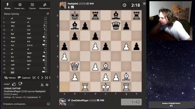 Друзья, всем привет. Партия со стрима, представляю вашему вниманию. Шахматы. Блиц 3+0 на chess.com. Если интересно, - подписывайтесь на канал, ставьте лайки, оставляйте комментарии. Поддержка через: DonationAlerts: https://www.donationalerts.com/r/onedebutplayer Бусти: https://boosty.to/onedebutplayer/donate Donatepay: https://new.donatepay.ru/@1272445