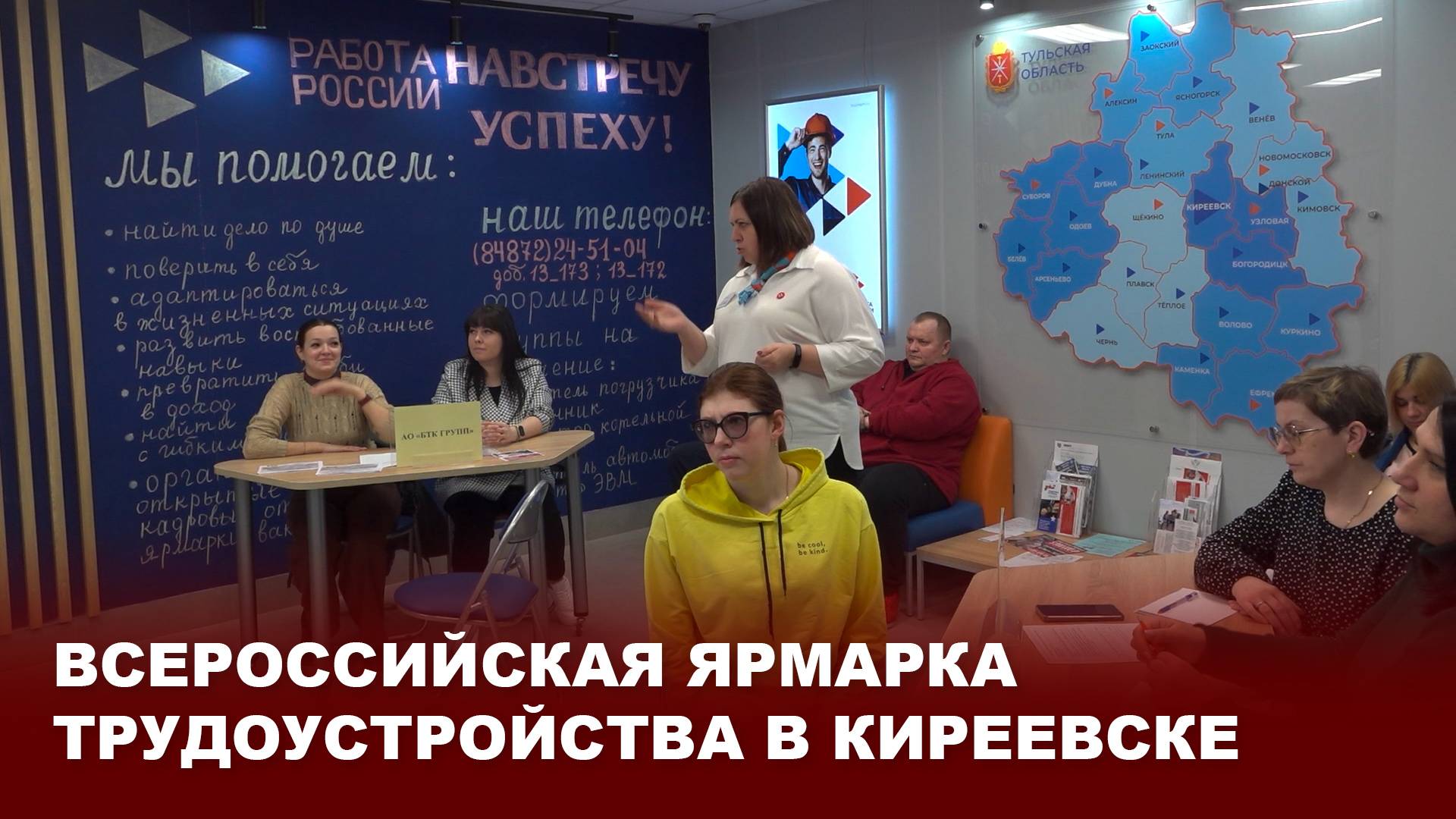 18 апреля по всей стране, в рамках нацпроекта «Кадры», прошел региональный этап Всероссийской ярмарки трудоустройства «Работа России. Время возможностей». В центре занятости населения Киреевского района также состоялось мероприятие в рамках акции. Его участниками со стороны работодателей выступили представители ООО «ШЭЛА», «БТК текстиль», «БТК групп» и охранного предприятия, соискателями стали жители района, ищущие работу и студенты Болоховского машино-строительного техникума. Тему продолжит наш следующий сюжет.