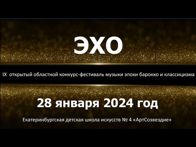 28 января 2024 г. в Екатеринбургской детской школе искусств № 4 «АртСозвездие» состоится IX открытый областной конкурс-фестиваль «Эхо». На конкурсе-фестивале исполняется музыка эпохи барокко и классицизма. К участию приглашаются учащиеся ДШИ и ДМШ следующих специальностей: специализированное фортепиано, общее фортепиано, деревянные духовые инструменты (блокфлейта, флейта, гобой, кларнет, фагот). Конкурс-фестиваль проводится в очном формате. Для иногородних участников возможно дистанционное участие (по видеозаписям). Заявки принимаются до 22 января 2024 г. Лауреаты конкурса выступят на заключительном концерте в культурно-просветительском центре «Царский» 2 февраля 2024 г. Ссылка на исполнителя D. Scarlatti, Sonata in A major, K. 322 (Andrei Andreev) https://www.youtube.com/watch?v=MbRuwEWRJ4c