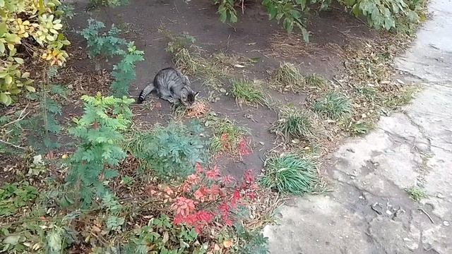 Голодный уличный серый котишко наворачивает корм! ^^
