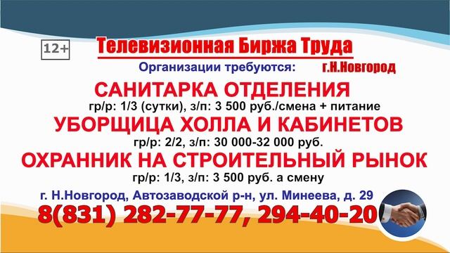 01-14.07.2025г. в 08.50, 17.50 - Телевизионная Биржа Труда на телеканале ВОЛГА в Нижнем Новгороде