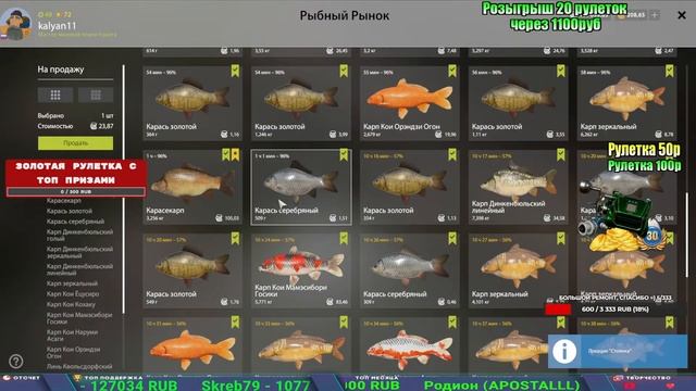 Поддержка донатом https://new.donatepay.ru/@1032463 Альтернативный донат https://www.donationalerts.com/r/kalyamba11 5536913964533059 карта Тинькоф Если стрим лагает,смотри стрим на трово https://trovo.live/s/Kalyamba_na_Ribalke Мой ВК - https://vk.com/kalyantv НИК в игре kalyan11 НАШ ДИСКОРД СЕРВЕР https://discord.gg/3ZeEDGs5h6 Заказ водоема на 1 час - 500р ( весь стрим 2500р ) Модерка на канале 1300р ( каждая следующая на 100р больше) ✅Призы в рулетке "ЗОЛОТАЯ" 500р ✔ ЗОЛОТО ✔ ПРЕМ ✔ КАТУШКИ РАПТОР 40, ВЕНГИ, ТАЙГА, СИЛЬВЕР 80, И другие ✔ ПАЛКИ ПИЛКЕРНАЯ, ДОНКА МОРСКИЕ, ✔ РОД ПОД, СТУЛЬЯ ✅Призы в рулетке СТАНДАРТ : 100р ✔ катушкИ РАПТОР 40, ВЕНГИ, ТАЙГА, СИЛЬВЕР 80, И другие ✔ катушки 60 для медного ( ЭВИИ, НАТОРЫ, ГОЛДА, и тд) ✔ ПИЛКЕРНОЕ УДИЛИЩЕ КОРОЛЕВА ОКЕАНА ✔ Морское Донное удилище ✔ прем ( 3, 7, 30 дней) ✔ золото ( 1, 3, 5, 10, 20 ,50) ✔ билет на море ( 1, 3, 5 дней) ✔ голд наживка и др. ✅Призы в рулетке "СТАРТОВАЯ" 50р ✔ катушка Венга ✔ катушка "silver80" ✔ катушка "БЕЛЫЙ КАЛИБР" ✔ катушка "Черный калибр" ✔ катушка "Протон" ✔ катушка "Нарга 6000" ✔ Набор Фидерист и спинингист ✔ Карповик Фортуна ✔ фидерные удилища ✔ прем, золото, алкашка, наживки и тд P.s Рулетка это не казино, а награда за поддержку стримера. Вечный ТОП ПОДДЕРЖКИ (10.06.2025) 1. Леха сварной 214 572 2. Dimon_pokemonchik 127 034 3. Skreb79 103 061 4. Interceptor 96 230 5. FishRus86 82 500