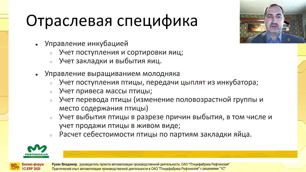 Практический опыт автоматизации производственной деятельности в ОАО «Птицефабрика Рефтинская» с решениями 1С. Докладчик: Владимир Рукин, Руководитель проектов 1С-Рарус. Бизнес-форум 1С:ERP онлайн 18 ноября 2020. Подробнее об автоматизации https://rarus.ru/1c-corp/projects/ptitsefabrika-reftinskaya/