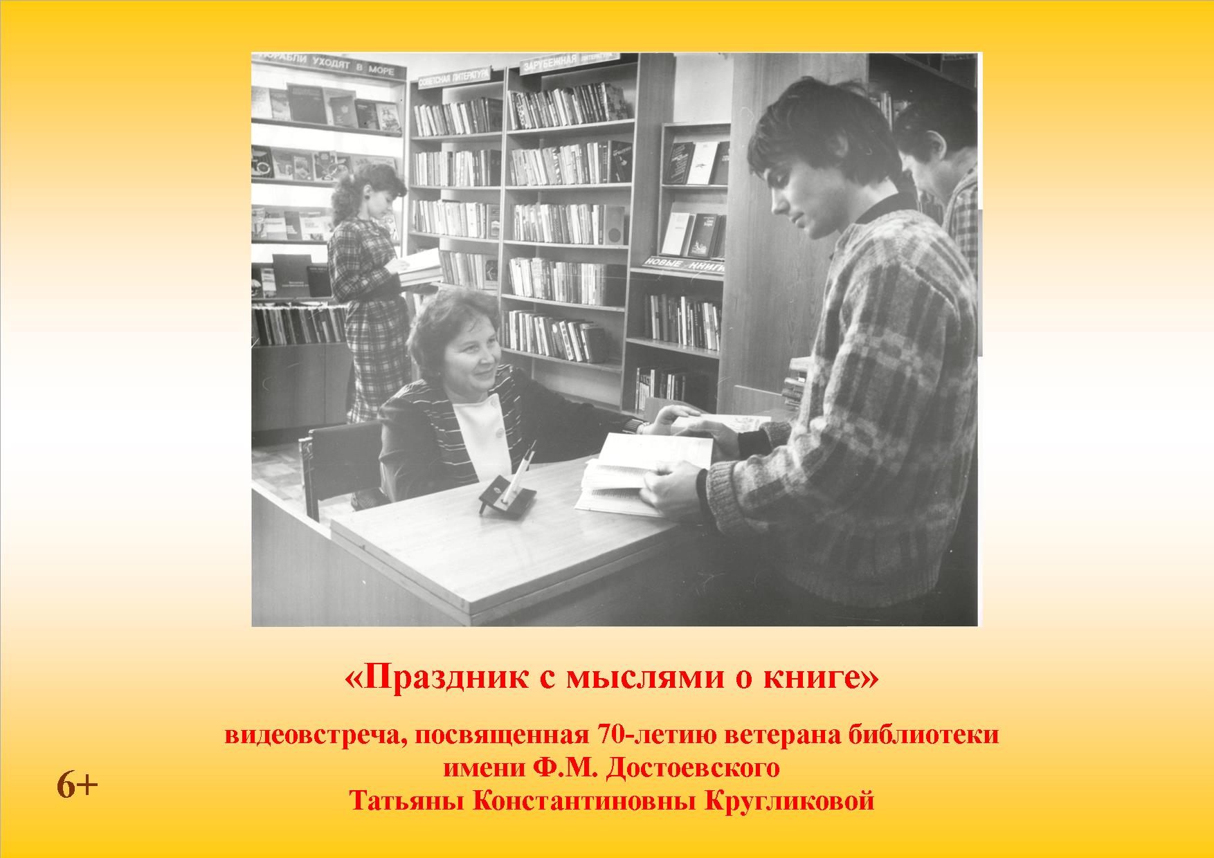8 февраля юбилей у ветерана библиотеки имени Ф.М. Достоевского Татьяны Константиновны Кругликовой. Библиотека-филиал №13 имени Ф. М. Достоевского представляет юбилейную видеовстречу «Праздник с мыслями о книге», посвящённую этой дате.