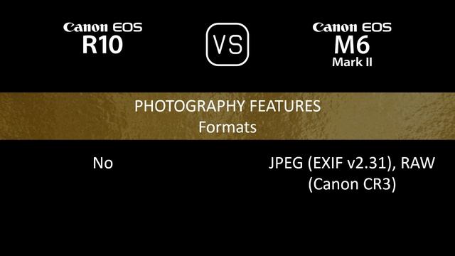 This video overviews the Canon EOS R10 and the Canon EOS M6 II in a parallel comparison of specifications. Thanks for watching. If you liked this video and found it informative, make sure to subscribe for more. 00:24 LAUNCH 00:32 BODY 00:40 SENSOR 01:05 IMAGE 01:17 OPTICS & FOCUS 01:41 SCREEN 01:58 VIEWFINDER 02:14 PHOTOGRAPHY FEATURES 03:15 VIDEOGRAPHY FEATURES 03:31 STORAGE 03:35 CONNECTIVITY 03:59 PHYSICAL 04:16 MISC