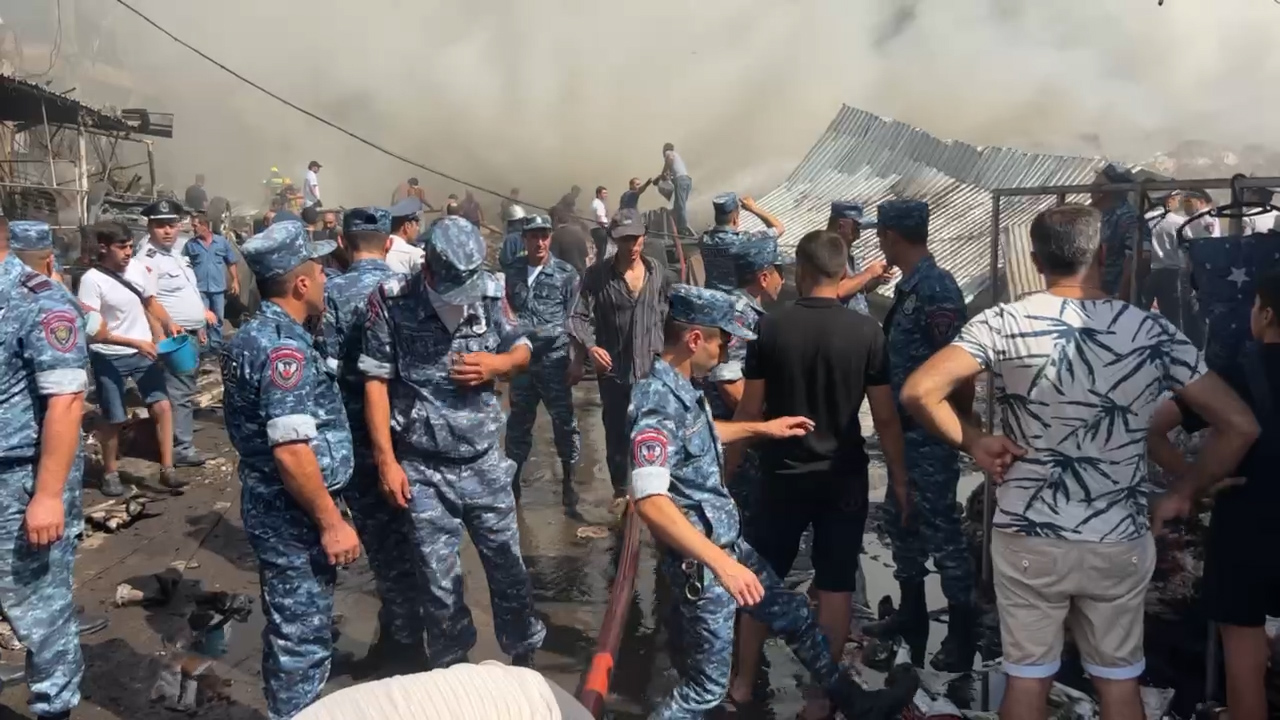 В тушении огня на территории ереванского торгового центра принимают участие не только спасатели, но также рядовые граждане. Есть новый очаг возгорания, граждане своими силами пытаются до прибытия пожарных не допустить распространения огня, заливая его водой из ведер.