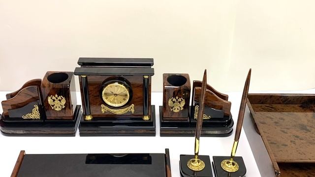 •Материал: обсидиан, кварцовый механизм, художественное литьё из бронзы. •Техника исполнения: камнерезные работы. •При заказе вы получаете образец, который представлен на фотографии. •Общие габариты настольного набора 770*450*190мм - Часы 190*75*154мм-1шт. - Основание под часы 200*110*28мм-1шт. - Календарница 375*135*27мм-1шт. - Бумажница 115*75*100мм-2шт. - Карандашница 75*75*120мм-2шт. - Основание под бумажницу и карандашницу 200*110*28мм-2шт. - Подставка с тюльпаном 70*70*115мм-2шт. - Подставка под флагшток 76*76*10-1шт. - Лоток 315*235*80мм. •Упаковка: деревянный чемодан обтянутый искусственной кожей, габариты чемодана 460*340*380мм. •Масса нетто: 15кг. •Масса брутто: 24,2кг.
