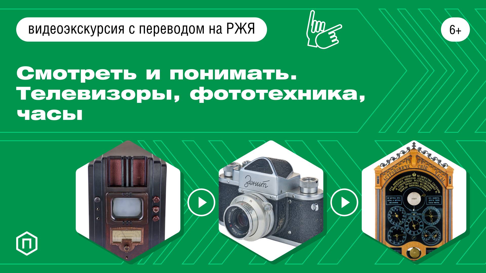 Видеоэкскурсия «Смотреть и понимать. Телевизоры, фототехника, часы» (спереводом на РЖЯ) знакомит с предметами, передающими информацию визуально, с предметами, которые были и есть во многих домах. На экскурсии мы расскажем, когда появились часы, какими были телевизоры до появления плоских экранов и какой путь прошла фотография. Это и многое другое вы сможете узнать, посмотрев нашу видеоэкскурсию.
