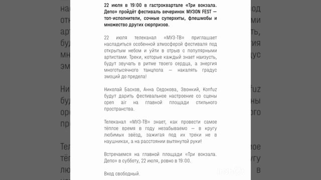 22 июля (в субботу) - Фестиваль «МУЗON FEST» в гастроквартале «Три вокзала. Депо» В гастроквартале «Три вокзала. Депо» пройдёт фестиваль вечеринок МУЗON FEST — топ-исполнители, сочные суперхиты, флешмобы и множество других сюрпризов. Николай Басков, Анна Седокова, Звонкий, Konfuz будут дарить фестивальное настроение со сцены open air на главной площади стильного пространства. 16+ Начало в 19:00 Гастроквартал «Три вокзала. Депо», ул. Новорязанская д. 23, стр. 1 Вход свободный #2023 #москва #бесплатно #музыка