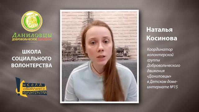 О волонтёрской группе Добровольческого движения «Даниловцы» в Детском доме-интернате №15, посещающей отделение «Милосердие», рассказывает координатор Наталья Косинова. https://danilovcy.ru/cause/dom-internat-dlya-detej-s-umstvennoj-otstalostyu-15-budni/ Кто наши подопечные, какие формы работы (прогулки) и правила посещения, особенности отделения «Милосердие» и многое другое, а также ответы на вопросы учащихся Школы координаторов волонтёрских групп-2020. Организаторы: Добровольческое движение «Даниловцы» http://www.danilovcy.ru/, Школа социального волонтёрства http://volonter-school.ru/, ГБУ Центр «Моя карьера» https://mycareer.moscow/#/applicant при участии Союза волонтерских организаций и движений http://volontery.ru/