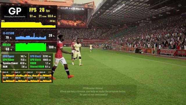 Hello, this time I'm going to test how good eFootball 2022 (PES 2022) will perform in Acer 476G. Don't forget to like, share, and subscribe! :D Enjoyy!! Feel free to ask/request System Specification Used: Acer E5-476G-54U3 CPU: Intel Core i5-8250U @ 1.6GHz - 3.4GHz (-82.0mV undervolted) GPU: NVIDIA GeForce MX150 2GB (undervolted to 0.925V @ 1683MHz) RAM: 4GB+8GB @ DDR4 2400Mhz Display : 1366x768 OS: Wndows 10 21H1 (OS Build 19043.1237) NVIDIA Driver: 471.96 Game: eFootbal 2022 (PES 2022) Software: Record: Windows XBox Game Bar Overlay: FPS Monitor Demo Undervolt: ThrottleStop, MSI Afterburner Timestamps: 00:00 Intro 00:04 Settings.exe 00:10 Low Preset 768p 05:52 Medium Preset 768p 11:00 Conclusion/Comparison