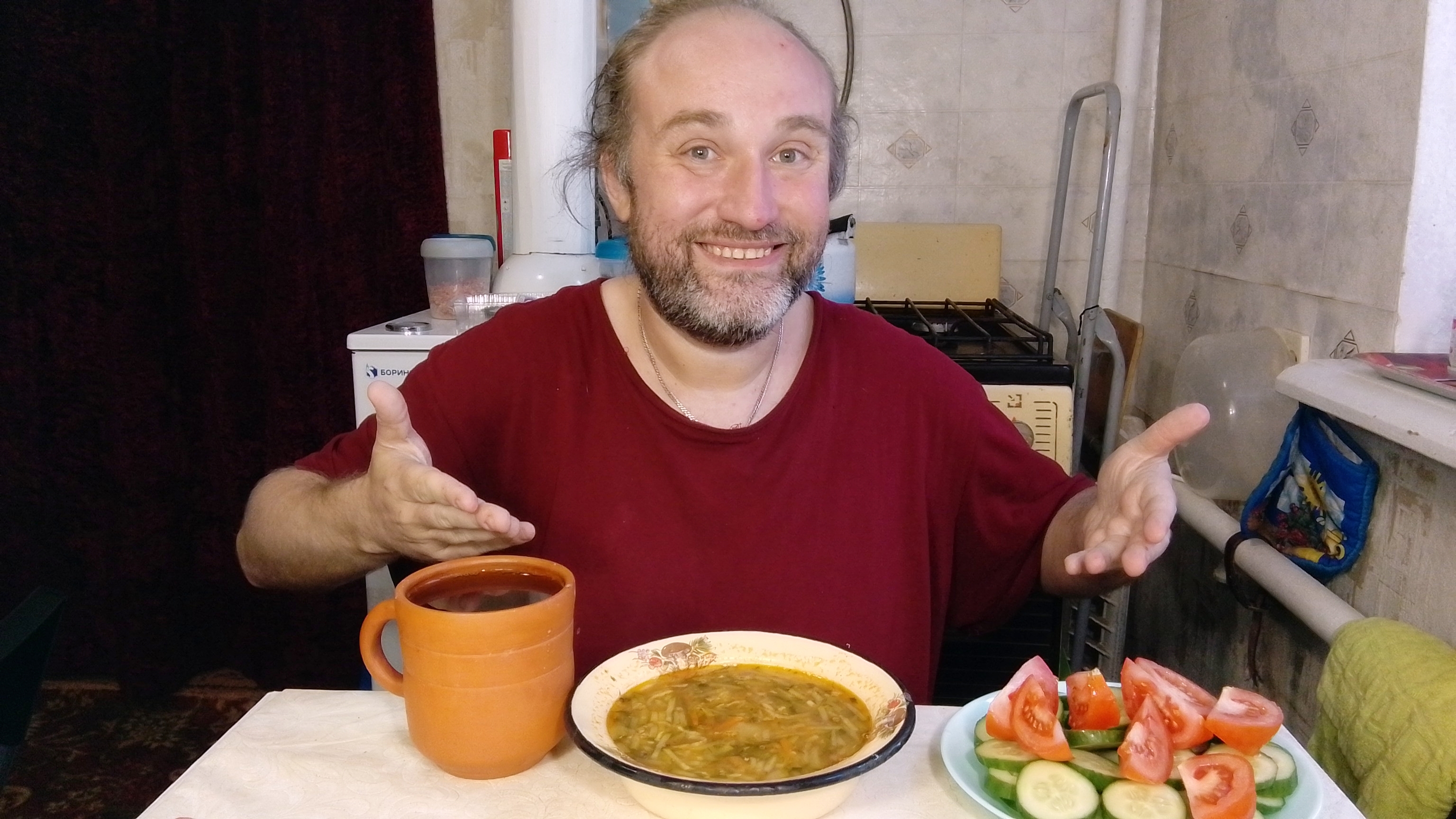 на обед вкусный супец из кильки в томате и кабака. мукбанг. обжор. еда на камеру. диета. шизофрения.