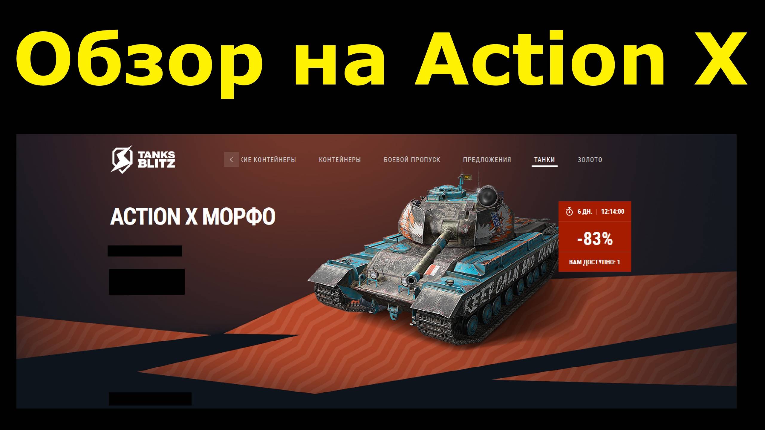 В этом видео я рассказываю о танке Action X, который появился в продаже за золото и реальный прайс в игре Tanks Blitz. ✅TanksBlitz Обзоры танков (плейлист): https://rutube.ru/plst/445862/ ✅Мой канал ВКонтакте: https://vk.com/oneshot_play1 ✅Мой канал на YouTube: https://www.youtube.com/@OneShot_Play ✅Мой второй канал по играм: https://rutube.ru/channel/41302499/ Ставьте лайки, рассказывайте друзьям и обязательно комментируйте! =) #wotblitz#tanksblitz#вотблитц#танкблитц#обзортанка#обзор