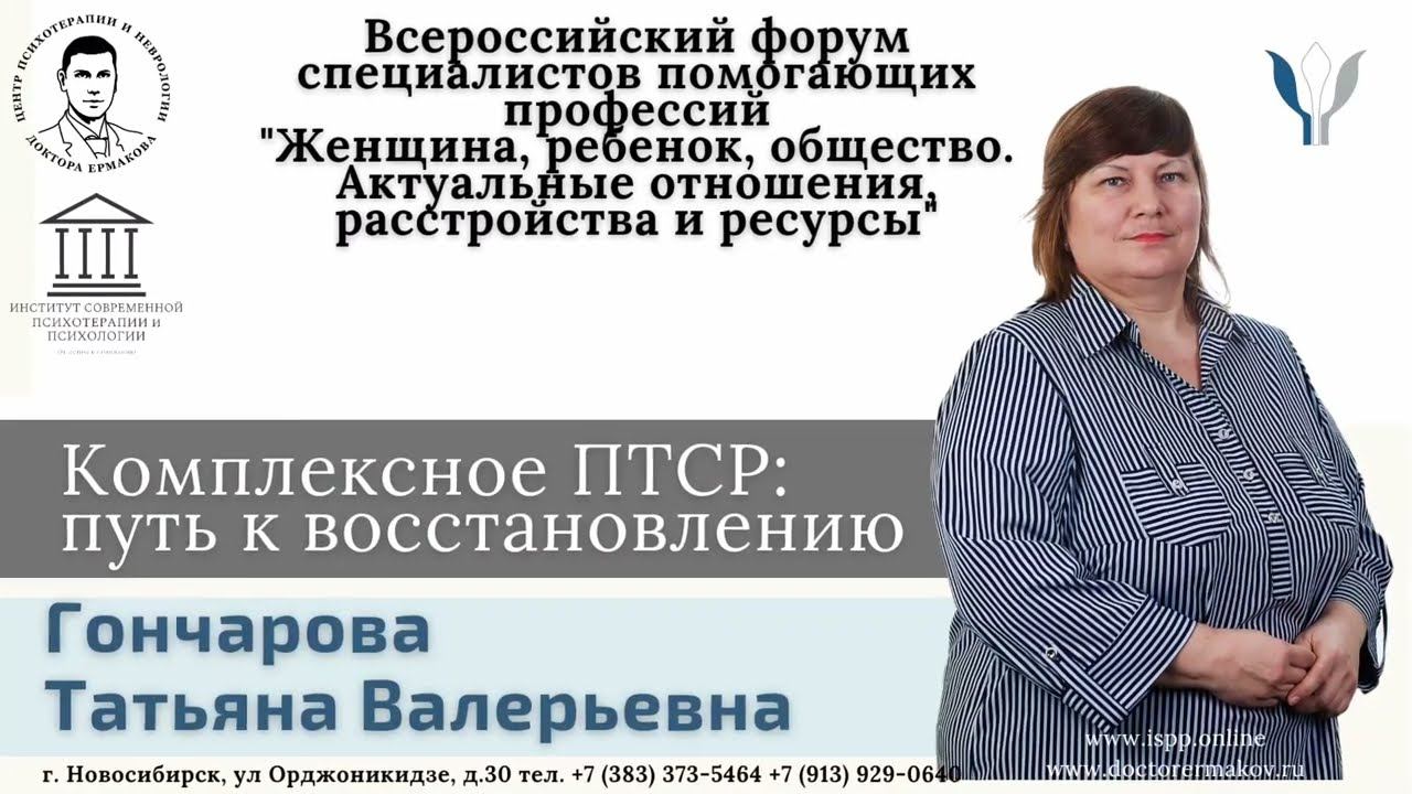 Гончарова Татьяна Валерьевна - врач-психотерапевт, психолог Центра психотерапии и неврологии Доктора Ермакова, действительный член ОППЛ и РПА. Новосибирск, Россия. Комплексное посттравматическое стрессовое расстройство ( К-ПТСР ) - это психологическое расстройство, которое может развиваться в ответ на длительный, повторяющийся опыт межличностной травмы в контексте, в котором у человека мало шансов или нет никаких шансов побега. Несмотря на способность человека выживать и адаптироваться, травматический опыт может настолько сильно пошатнуть психологическое, биологическое и социальное равновесие, что мешает наслаждаться человеку настоящим моментом, ведет к искаженному восприятию новых и уже знакомых ситуаций. В докладе обсуждаются причины КПТСР, симптоматика, отличие от ПТСР. Рассматривается возможности коррекции и психотерапии. Всероссийский форум специалистов помогающих профессий "Женщина, ребенок, общество. Актуальные отношения, расстройства и ресурсы" Канал ИСПП в телеграмм: https://t.me/isppnsk Группа ИСПП в Вконтакте: https://vk.com/modernpsychoterapy Центр Психотерапии и Неврологии доктора Ермакова: Телеграмм: https://t.me/doctorermakov Вконтакте: https://vk.com/doctorermakov