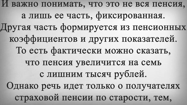 Кому и На Сколько ПОВЫСЯТ ПЕНСИЮ с 1 ДЕКАБРЯ. Российским пенсионерам рассказали об увеличении выплат с 1 декабря. Получать больше в первом зимнем месяце начнут сразу несколько категорий пожилых граждан. И для некоторых из них прибавка будет довольно существенной. В первую очередь увеличение выплат в декабре затронет тех пенсионеров, которые достигли определенного солидного возраста в ноябре. Тем, кому исполнилось 80 лет в конце осени, уже с декабря произведут перерасчет фиксированной выплаты к пенсии. Она станет в два раза больше: вместо текущих 7220 рублей будет уже 14 440 рублей. И важно понимать, что это не вся пенсия, а лишь ее часть, фиксированная. Другая часть формируется из пенсионных коэффициентов и других показателей. То есть фактически можно сказать, что пенсия увеличится на семь с лишним тысяч рублей. Однако речь идет только о получателях страховой пенсии по старости, тем, кто получает социальную пенсию или выплату по потере кормильца, такое увеличение не положено. Также с 1 декабря пенсию в увеличенном размере получат граждане, которые уволились с работы в августе. Им выплата придет уже с учетом всех пропущенных индексаций, а кроме того, они получат еще доплату за три месяца ожидания такой прибавки. Суммы у всех будут индивидуальные, единого показателя здесь нет. Наконец, рассчитывать на повышение пенсии в декабре смогут все, кто в ноябре подал заявление на перерасчет выплаты, и это заявление им одобрили. Например, пенсионер смог подтвердить неучтенные периоды стажа для пенсии или же у него появился иждивенец, за которого полагается надбавка в размере 2400 рублей в месяц. Ставьте лайк если считаете, что с 1 декабря необходимо повысить пенсии всем пенсионерам и напишите какое должно быть это повышение?