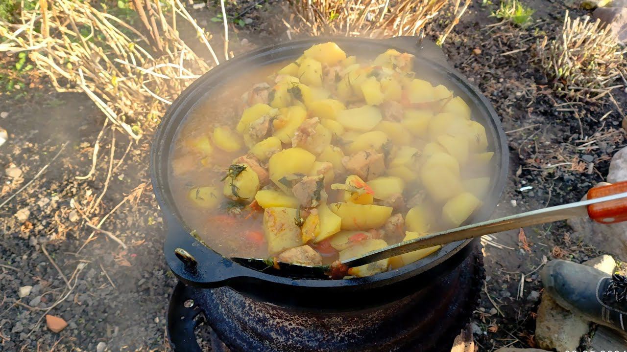 тот самый, "жареный суп" по знаменитому рецепту. в казане на огне готовлю обед (шурпа)