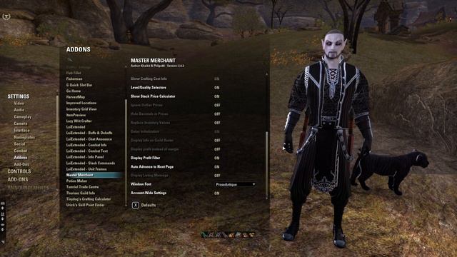 An overview of my settings and how to use Awesome Guild Store, Master Merchant and TCC. Must Have 1. HarvestMap - Allows you to keep track of any nodes you gather in the world. 2. Map Pins - Shows Skyshards, Lorebooks, POI's etc on your map. 3. AwesomeGuildStore - Adds a lot of useful search/selling functionality to the Guild Store. 4. Master Merchant - Displays pricing information on items. UI Addons 1. Lui Extended - Allows you to customise how your UI looks, takes a little time to set up. 2. Dark UI - Makes your UI look a bit darker and a lot cleaner (Works with Lui as well). 3. Votan's Minimap - Adds a minimap to the game. 4. Inventory Grid View - Changes your inventory from the standard list view to show as a grid. Crafting 1. CraftStore Wolfhunter - Must have addon if you do crafting. Keeps track of research and allows you to track everything. 2. Potion Maker - Makes Alchemy a lot easier. 3. Deconstruction Assistant - Separates your bank items from your inventory. Other Useful Addons 1. Combat Metrics - Adds a DPS meter to the game. 2. Harven's Improved Skills Window - Makes the skills window a lot cleaner and easier to read. 3. Votan's Fisherman - Stores what type of bair each fishing hole requires. 4. Votan's Fish Fillet - Allows you to fillet a full stack of fish instead of 1 by 1. 5. Urish's Skill Point Finder - Keeps track of what skill points you have and what ones you need. 6. Untaunted - Useful addon for tanks to track taunt duration. 7. Dressing Room - Allows you to store skill and gear setups. 8. FCM Quest Tracker - Allows you to customise the quest tracker, making it much easier to follow. 9. Addon Selector - Allows you to set addon profiles. Turn off all those heavy addons when in pvp etc 10. Votans Keybinder - Account wide keybinds!! 11. Guild Events Improved