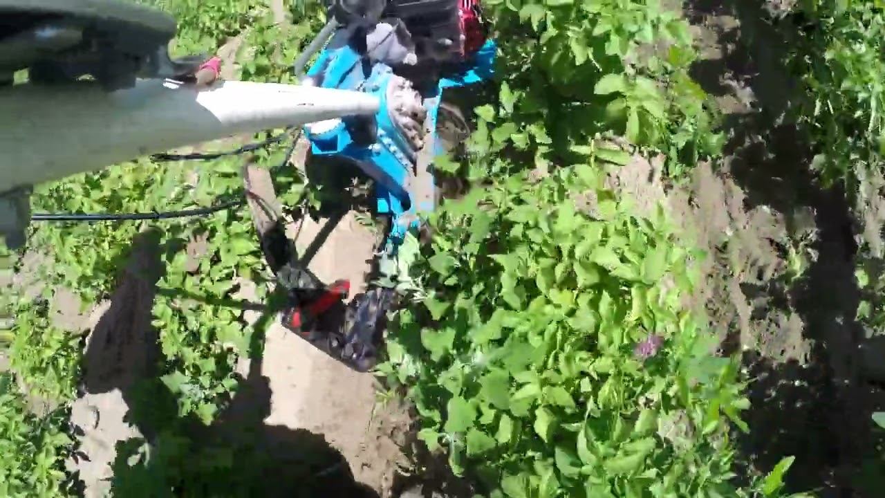 Культиватор Нева МК-100 на прополке и рыхлении междурядий на концевых фрезах с плоскорезом вместо сошника