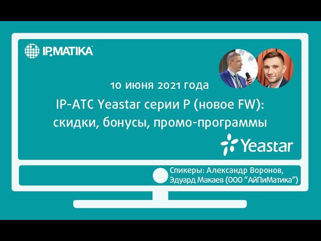 10 июня 2021 года сотрудники компании АйПиМатика Александр Воронов и Эдуард Макаев провели вебинар "IP-АТС Yeastar серии P (новое FW): скидки, бонусы, промо-программы". Программа вебинара: - IP-АТС Yeastar серии P: решение для предприятий с высокими требованиями к бизнес-коммуникациям; - новый релиз программного обеспечения, расширенные возможности и новые услуги для пользователей; - развитие линейки продукта, функции, доступные в следующем релизе; - как протестировать IP-АТС Yeastar серии P; - как пройти обучение по инсталляции IP-АТС Yeastar серии P и получить сертификат; - как получить скидку на IP-АТС Yeastar серии P и повысить партнерский статус; - действующие промо-программы для партнеров.