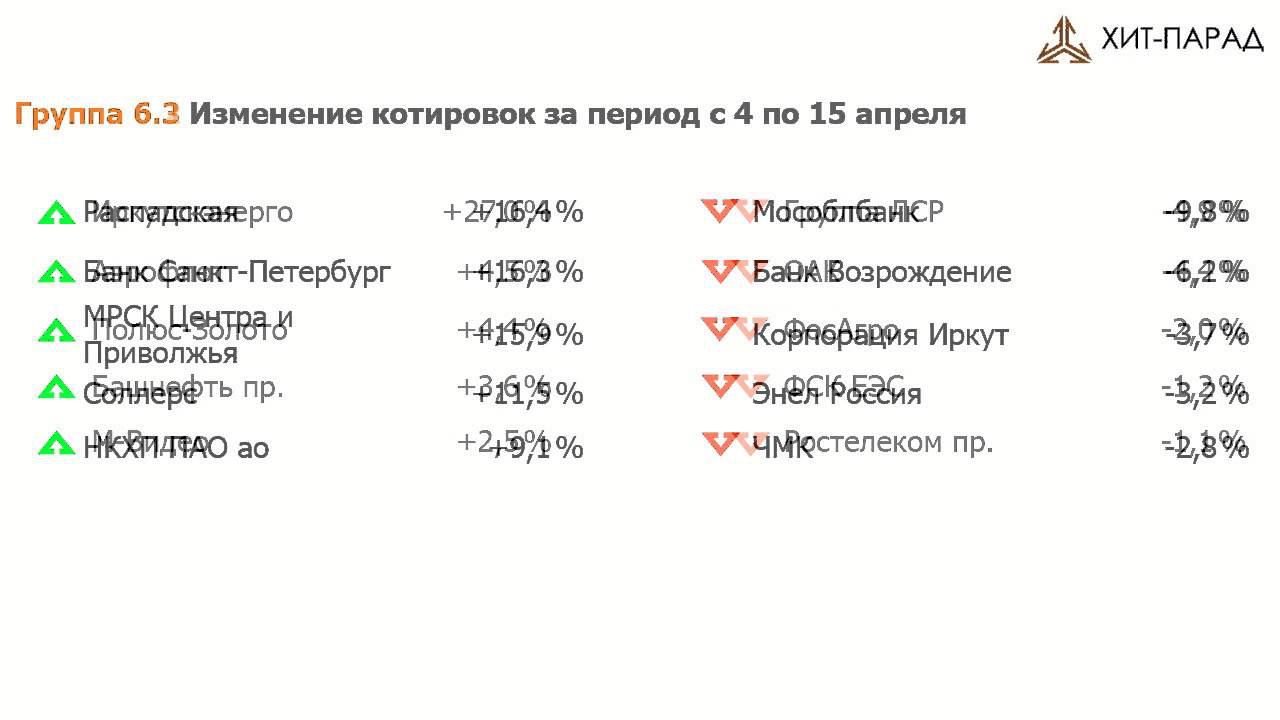 Видеопередача о динамике рынка акций за период с 1 по 15 апреля 2016 года. Хит-парад эмитентов на 18 апреля 2016 года