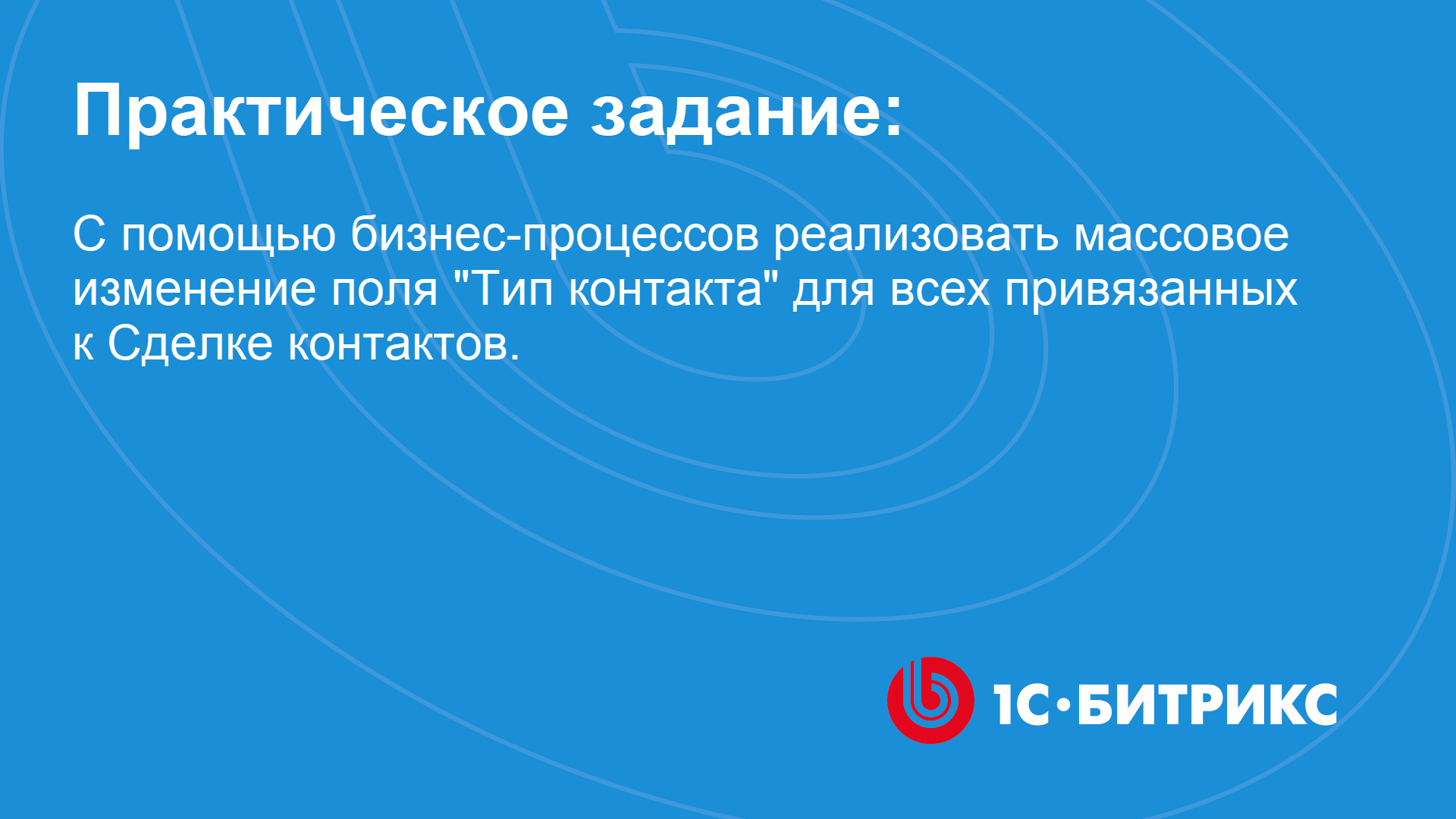 ** видео без голосового сопровождения К уроку Практические задания в главе Действия курса Бизнес-процессы: https://dev.1c-bitrix.ru/~pfW3N Задание № 3: Для выполнения этого задания предварительно привяжите к одной Сделке несколько Контактов. Теперь с помощью бизнес-процессов реализуйте массовое изменение поля Тип контакта для всех привязанных к Сделке контактов. Указанное поле Контактов должно измениться по запуску БП из Сделки. Новое значение для поля указывает пользователь при ручном запуске БП.