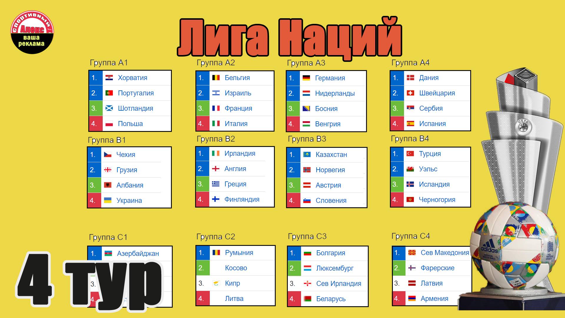 Футбол. Лига Наций УЕФА. 4 тур. Расписание, таблицы.