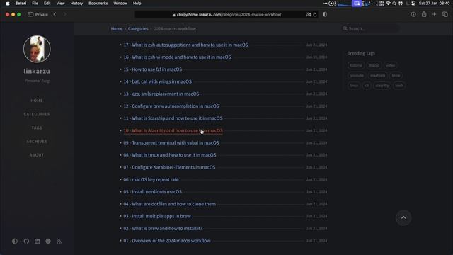 Link to my blog related to this video: https://linkarzu.com/posts/2024-macos-workflow/overview/ Link to playlist found below: https://www.youtube.com/playlist?list=PLZWMav2s1MZTanWwNKYvS8qgwl0HBH9J- ----------------------------------------------------------------- In this video series we’ll set up your terminal to look like mine, we’ll use my configuration files and I’ll guide you through every step of the way. We’ll also go over the command line tools I use every day so you can understand how they work, and how to set them up As of Jan 27 2023, not all the videos are recorded, so not all the pages will be posted, but I’ll update the pages as the rest of the videos are released.