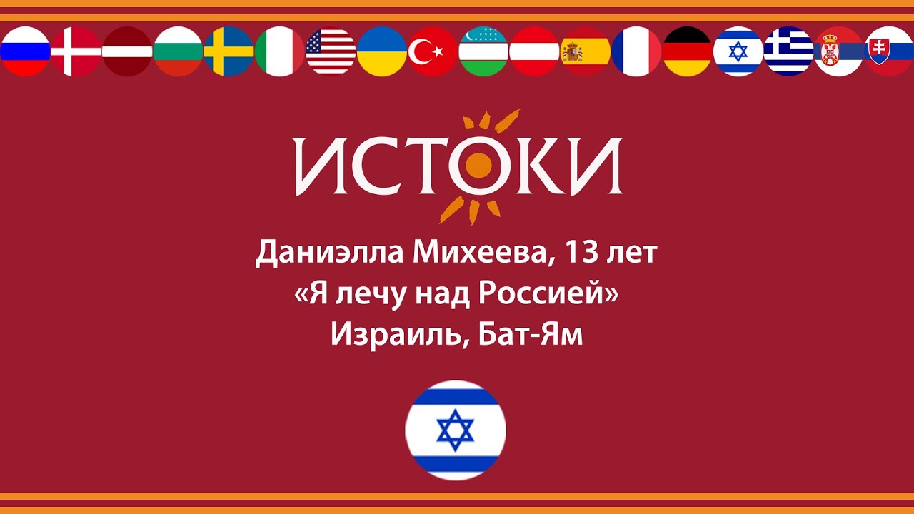 Даниэлла Михеева, 13 лет - старшая возрастная группа Израиль, город Бат-Ям Песня «Я лечу над Россией» Даниэлла занимается с 6 лет в театре песни «Цветы Израиля». Лауреат многих международных конкурсов. По итогам национального отборочного тура, которым стал Фестиваль талантливых детей "Калейдоскоп", Даниэлла получила именное приглашение на фестиваль «Истоки». Фестиваль-конкурс русской культуры «Истоки» ставит своей задачей показать многообразие и красоту русской культуры, которая на протяжении многих веков формировалась за счет традиций многонациональности и добрососедства. Фестиваль-конкурс русской культуры «Истоки» - многоплановое мероприятие, которое объединяет конкурс вокалистов, обширную экскурсионную и культурную программу, концертные выступления, гала-концерт и награждение участников фестиваля-конкурса. Мы расширяем русскоязычное пространство. Благодаря поддержке Россотрудничества в фестивале принимают участие дети-соотечественники, проживающие за рубежом. Сайт: www.festistoki.ru E-mail: festistoki@mail.ru