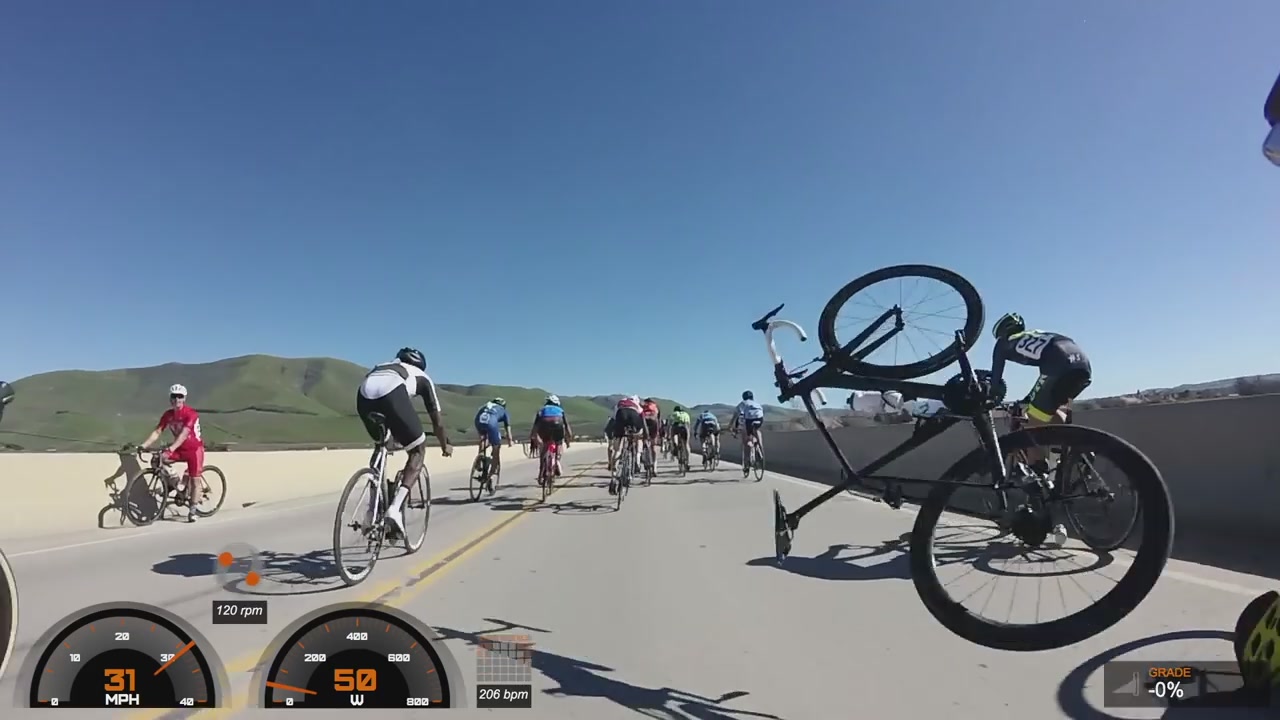 Велогонка в Санта-Барбаре (штат Калифорния) едва не закончилась гибелью одного из участников, который чуть не упал с 9-метрового моста после столкновения на трассе. В результате происшествия велосипед упал в русло высохшей реки, а гонщик Майк Аллеко успел ухватиться за край моста, что спасло ему жизнь.