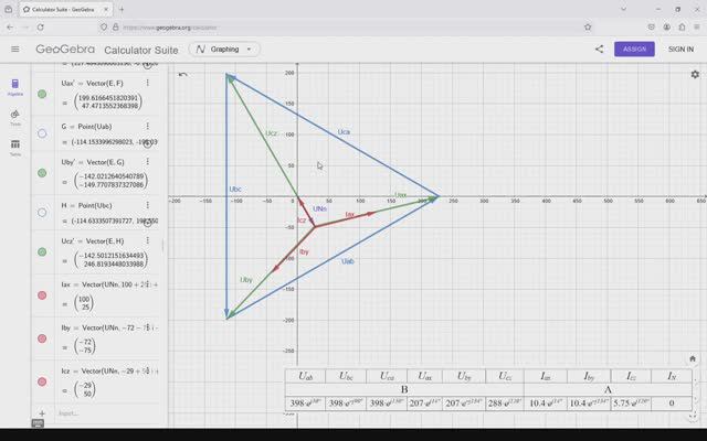 Электротехника и электроника. Трехфазные цепи. Звезда без нейтрального провода. Векторная диаграмма. GeoGebra. Комплексные числа. Напряжение. Ток.