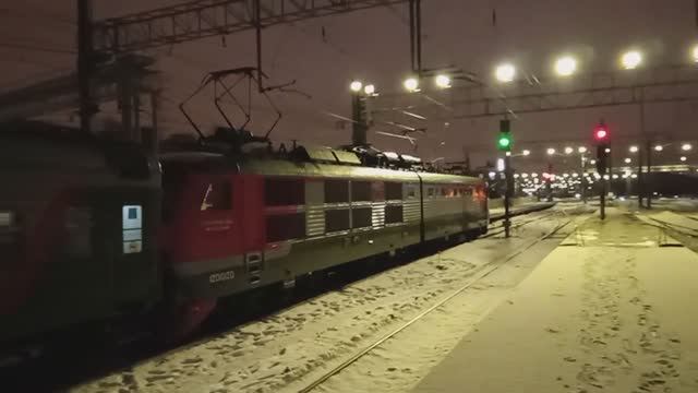 ЧС6-006 с поездом № 27 отправляется из Петербурга зимним вечером